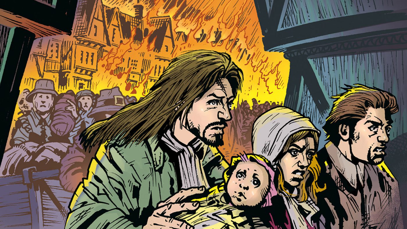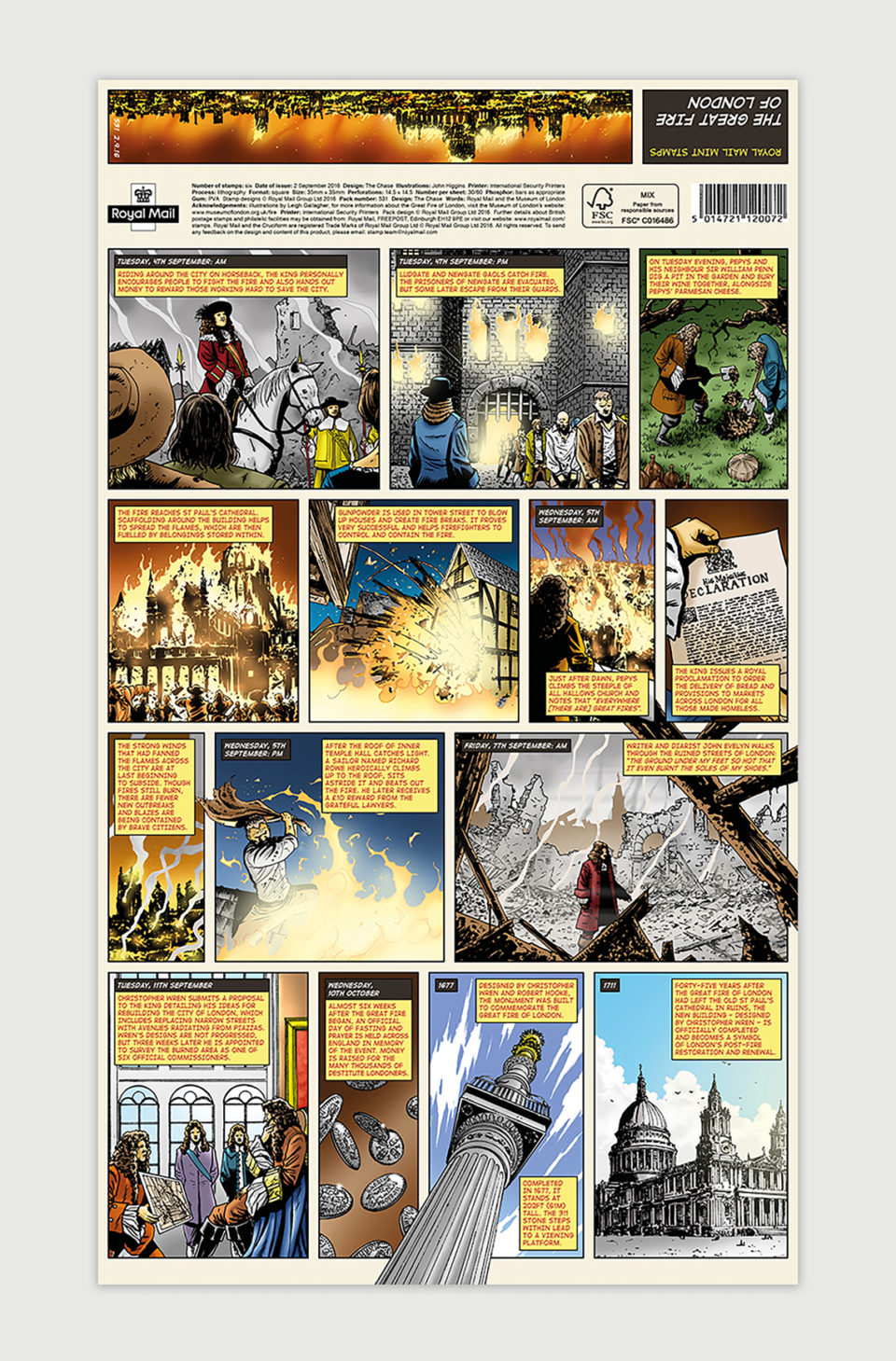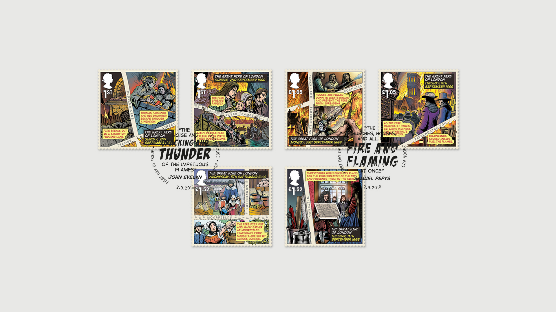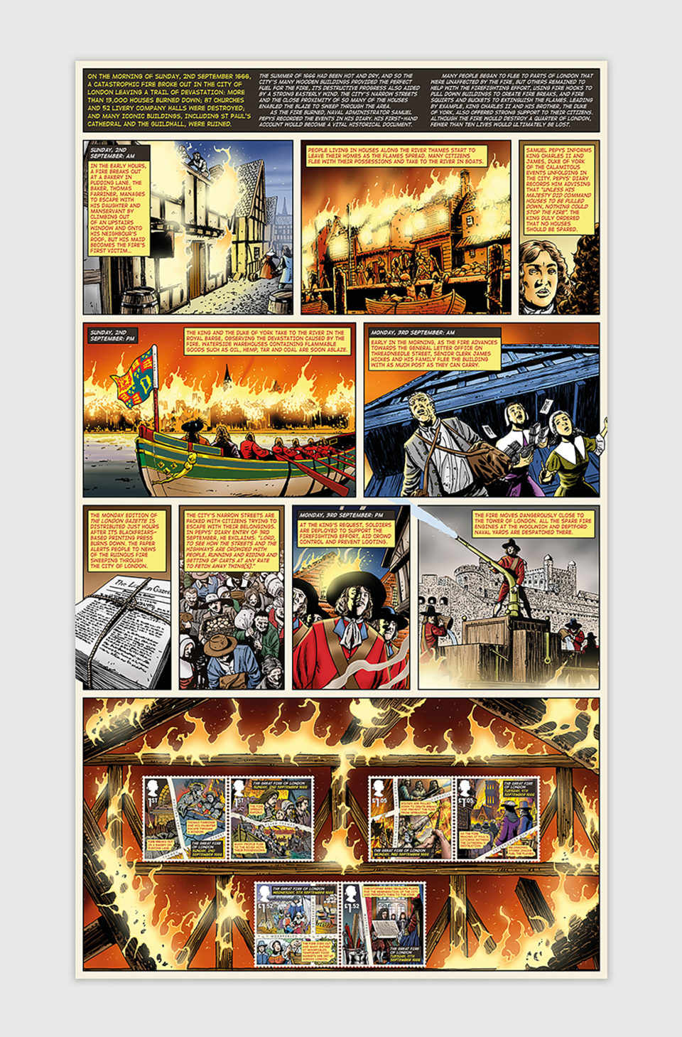 Designed to appeal to a younger audience, London’s streets and the River Thames divide our Great Fire of London stamps into graphic novel style panels adding a sense of place as the drama and panic of the story unfolds.